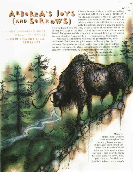 Погода на Арборее отличается непредсказуемостью и необузданностью. Легкий ветерок может смениться яростной бурей с молниями и градом в считанные минуты (к счастью для путешественников, буря обычно будет тоже недолговечной). Ландшафты этого Плана могут быть какими угодно — но только не заурядными. Равнины и степи тут бескрайни, реки — широки и величавы или узки, но быстры и бурны, леса могут быть величественными царствами древесных исполинов или мрачными, непролазными чащобами. География Арбореи непостоянна — у каждого леса, горы, реки есть хранитель из числа природных духов. Подобно большинству жителей этого Плана духи скоры на дружбу и на вражду, и больше всего не терпят равнодушия — и если дух-хранитель сочтет себя обиженным путешественником, он может поменять ориентиры, заставить лес расступиться или запутать путника, изменить русло реки…