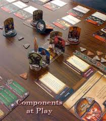 Игровой стол во время сессии по WHFRP 3. Видны зоны игроков с их карточками и активное использование жетонов
