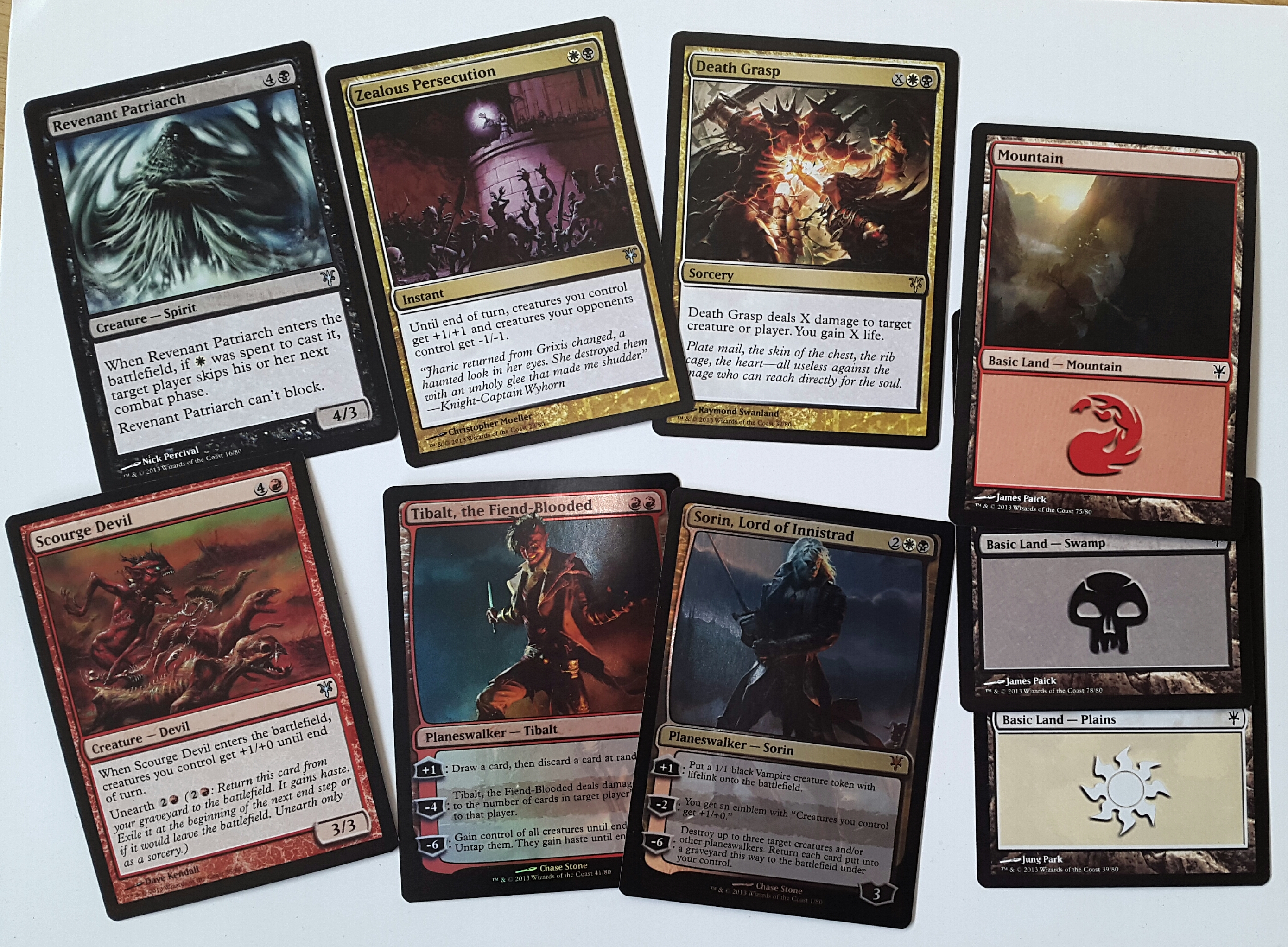 Фрагмент колоды коллекционных карт (Magic: the Gathering) из дополнения «Сорин и Тибальт» по Иннистраду. Снизу по центру две карты героев: Тибальта Демонокровного и Сорина Маркова. Слева две карты существ — дьявола и духа, сверху две карты дополнительных эффектов, справа карты местности: гора, болото, равнина.