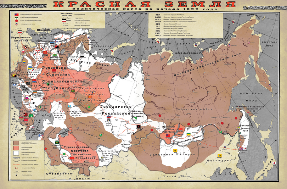 На момент начала игры в составе «Красной земли» состоят свыше 20 государственных образований, имеющих республиканское, диктаторское, демократическое либо анархическое устройство. Руководство государств принадлежит к тем или иным партиям, представленным в Российской империи на момент ее крушения: большевикам, меньшевикам, социалистам-революционерам, конституционным демократам, анархистам, монархистам. Также часть территорий управляется командующими оккупационных сил великих держав — Великобритании, США, Японии.