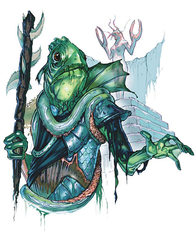 Жрец куо-тоа. На заднем плане статуя богини Блибдулпулп. Иллюстрация из книги «Underdark».