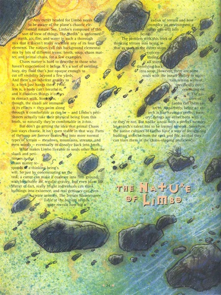 В DMG Лимбо описывается в более-менее традиционном виде (хотя иллюстрации показывают его ближе к Стихийному Хаосу D&D 4, чем к "бурлящему супу" AD&D 2), но правила по стабилизации Лимбо даны в качестве опциональных, хотя художественный текст говорит о гитзераях, удерживающих свои монастыри силой мысли. Видимо, подразумевается, что в базовом варианте персонажи будут использовать услуги NPC для спасения от проблем этого места. Интересно, что помимо стабилизации участков и движения, правила по контролю Лимбо позволяют изменять предметы, которые не являются частью снаряжения существ. В сжатом виде (в DMG Лимбо отведено менее страницы, причём большая часть отведена на художественное описание) эти правила не препятствуют, например, тому, чтобы планарный путешественник выпустил из рук меч, превратил его усилием воли в алмаз равного веса и унёс с собой назад (RAW не говорит ничего относительно того, что смена непостоянная или теряется за пределами Лимбо).