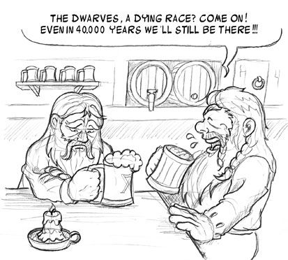 Шутка на тему дварфов и скватов. Веселящийся говорит печальному: «Это дварфы-то вымирающая раса? Взбодрись, мы будем тут и через сорок тысяч лет!»