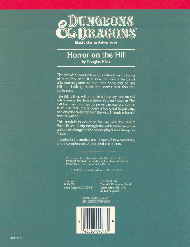 Сценарий «Horror on the Hill» был издан компанией TSR в 1983 году в виде 32-страничного буклета. Модуль включает в себя 11 карт, описания трёх новых монстров и полный набор прегенерированных персонажей.